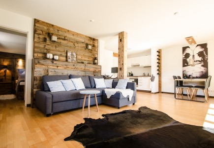 Nach einem Tag in den Bergen entspannen Sie in dieser liebevoll gestalteten Wohnung mit offenem Wohnbereich, moderner Hochglanzküche, gemütlichem Ecksofa und separatem Schlafzimmer aus naturbelassenem Holz.