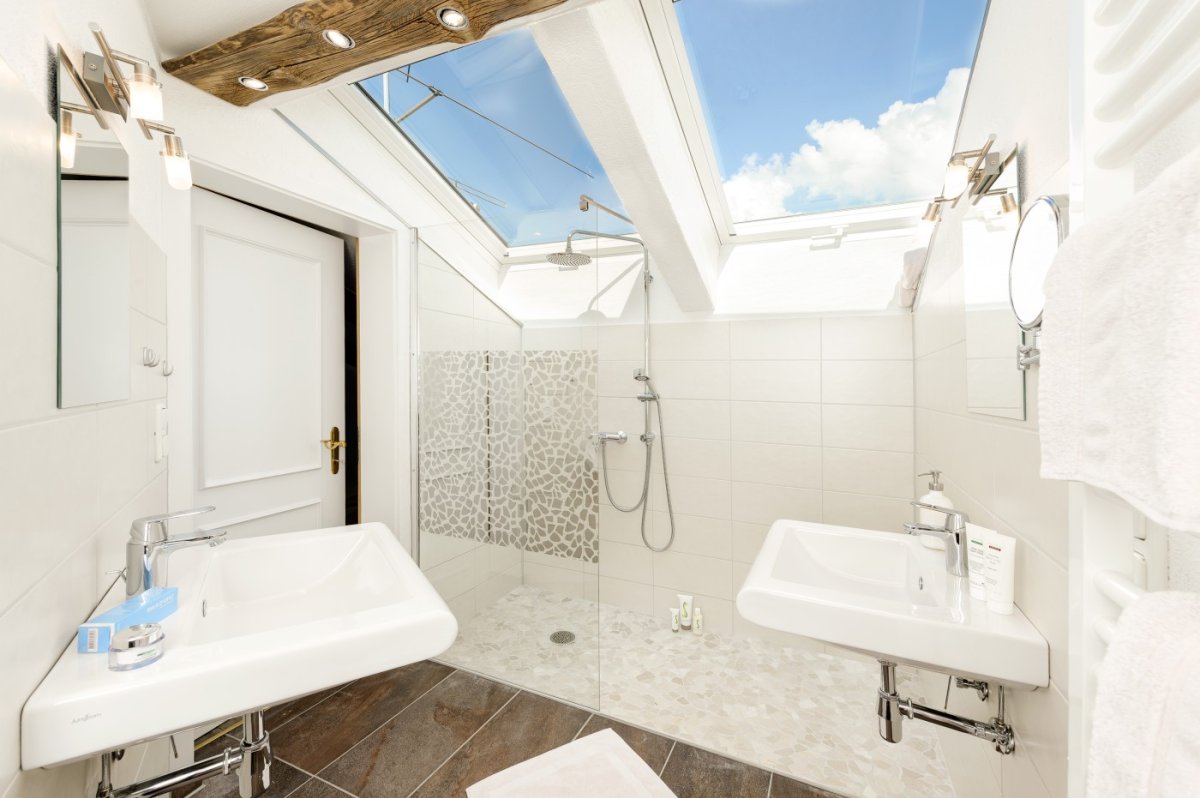• Badezimmer mit zwei Waschbecken, Dusch-/Badewanne, separate Toilette